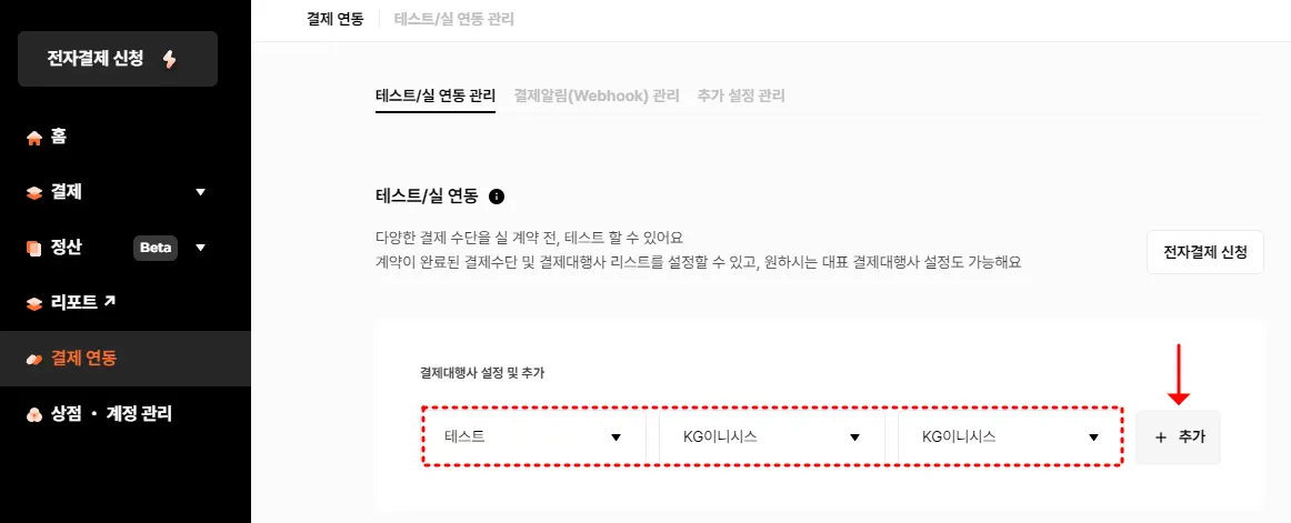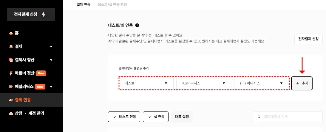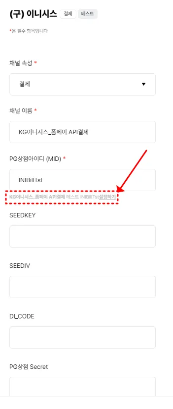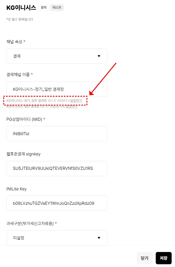 KG이니시스-정기_일반 결제창 테스트 INIBillTst 설정하기클릭