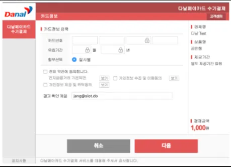 위와 같이 auth_mode : "key-in" 파라메터만 추가하시면 기존 다날 일반 결제창이 아니라 키인결제창이 호출되어 인증절차없이 결제프로세스가 진행됩니다.