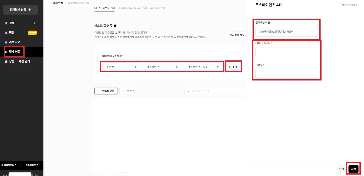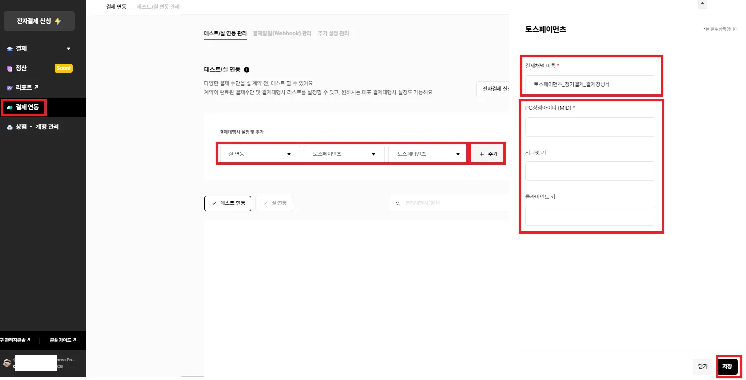 포트원 관리자 콘솔 > 결제연동 > 테스트/실 연동관리 > 결제대행사 설정 및 추가 “실연동 / 토스페이먼츠/ 토스페이먼츠 API ” > 결제채널 이름, 실상점정보 세팅 후 우측하단에 ‘저장’ 버튼 클릭
