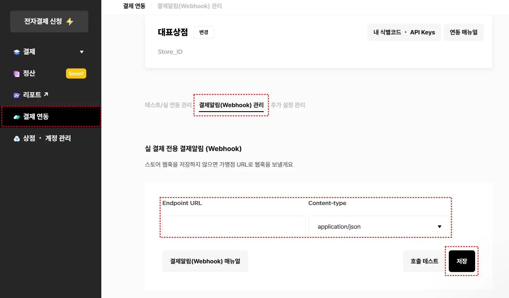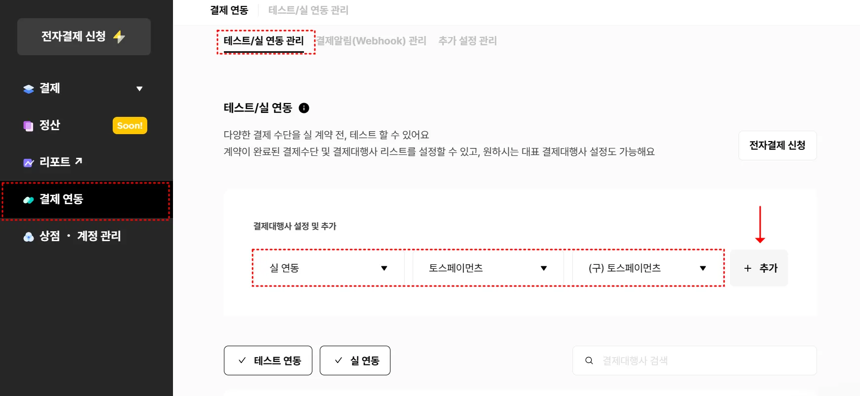 포트원 관리자콘솔( https://admin.portone.io ) 로그인 > 결제연동 > 테스트/실 연동관리 > 실연동 · 토스페이먼츠 · (구)토스페이먼츠 > +추가 후 상점정보 입력