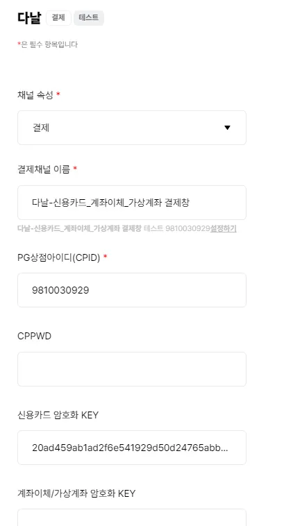 카드사 심사 완료 후에는 다날에서 발급받은 실상점 정보로 설정 해야 합니다.