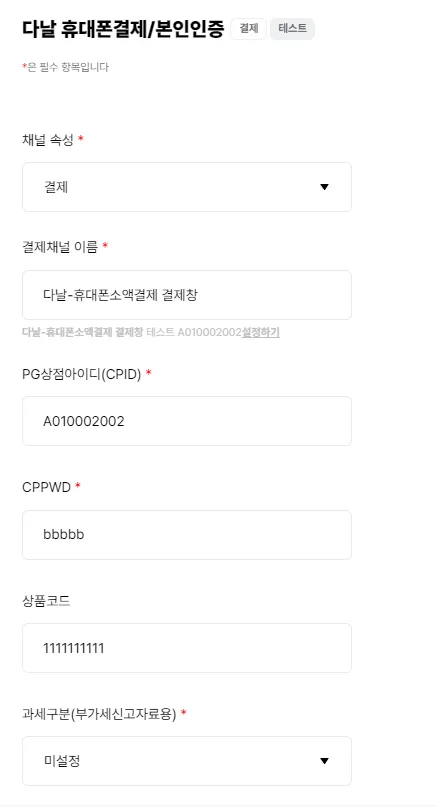 기본적으로 테스트용 상점정보 자동설정됩니다