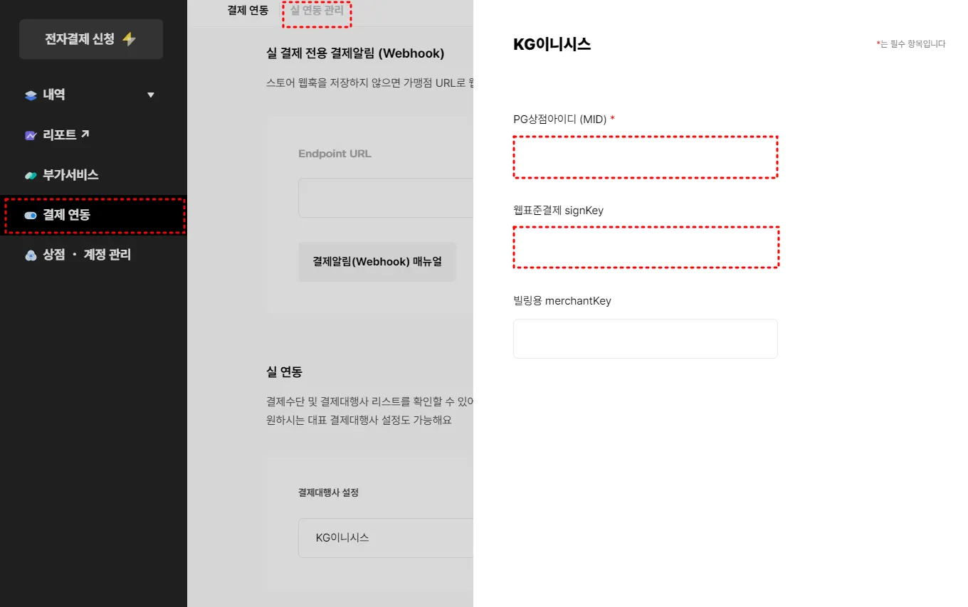 포트원 관리자콘솔 > 결제연동 > 실 연동 관리 > 결제대행사 설정 [KG이니시스] - [KG이니시스]선택 > + 추가 > 우측 화면 빈칸에 PG사로부터 받은 상점정보 입력 > 저장