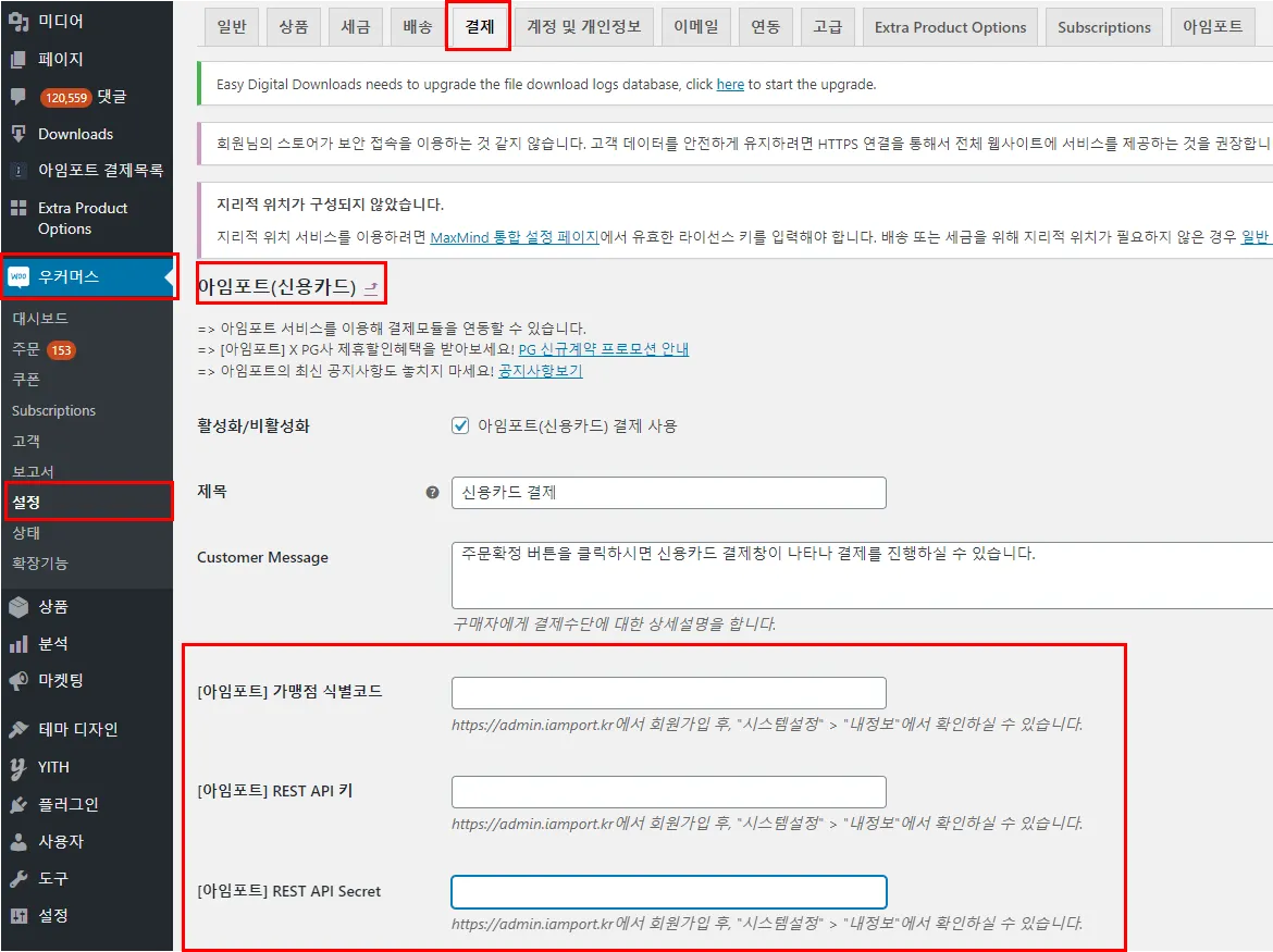 워드프레스 우커머스 결제연동 셋팅 방법은 연동메뉴얼 참고하시어 진행 부탁 드립니다.