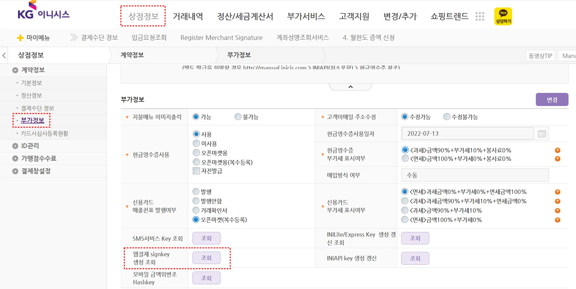 KG이니시스 상점관리자페이지 접속 > 상점아이디로 로그인 > 상점정보 > 부가정보 > 웹결제 signkey 생성 조회 [조회] 버튼클릭