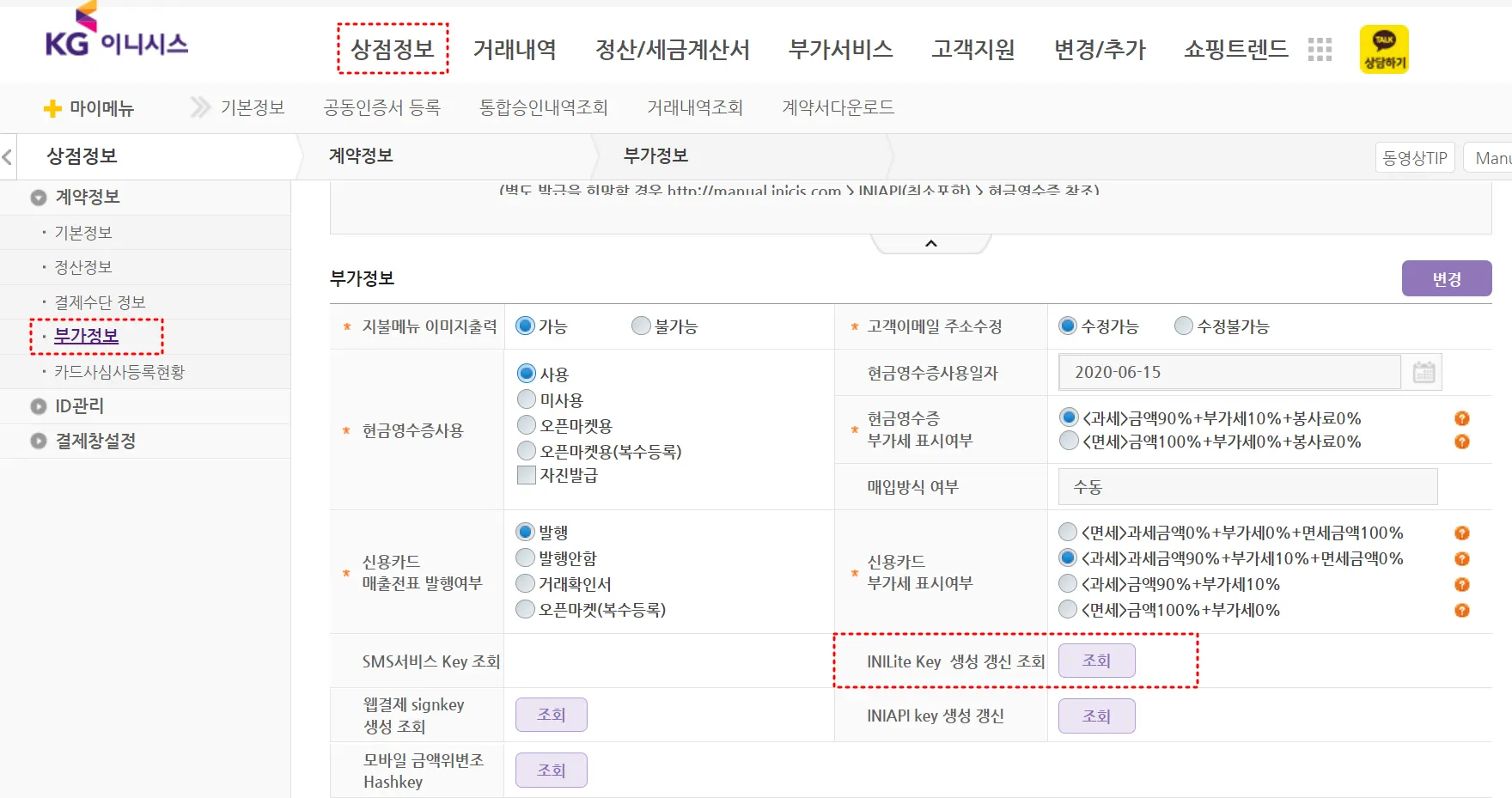 KG이니시스 상점관리자페이지 접속 > 상점아이디로 로그인 > 상점정보 > 부가정보 > INILite Key 생성 갱신 조회 클릭