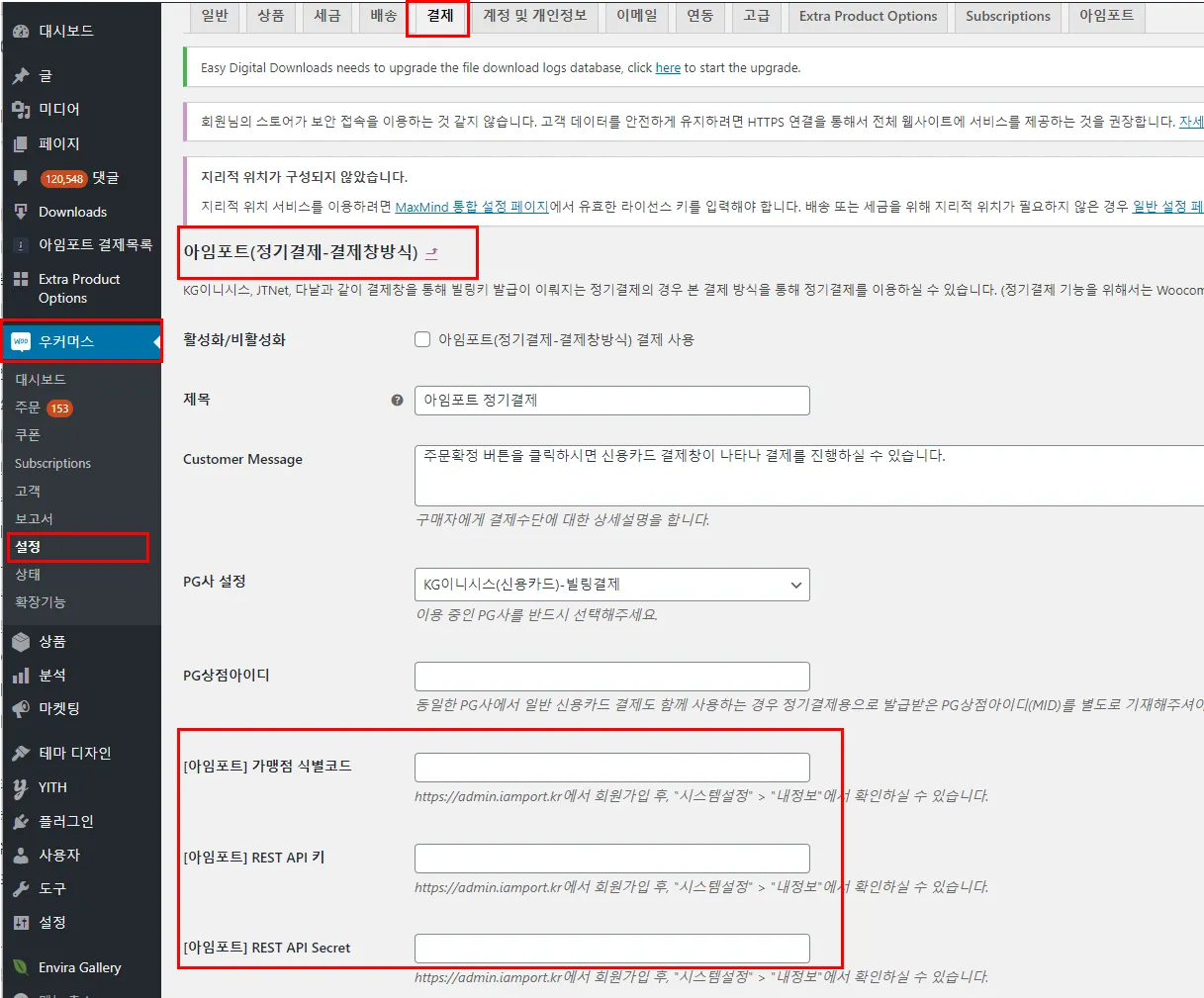 - 우커머스 > 설정 > 결제 에서 포트원 (정기결제/결제창방식)에 가맹점 정보(가맹점 식별코드, REST API , REST API secret) 값 설정이 필요합니다.