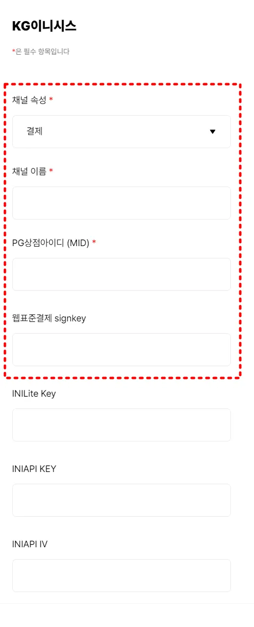 PG상점아이디(MID) : KG이니시스로부터 받은 상점아이디를 입력합니다.