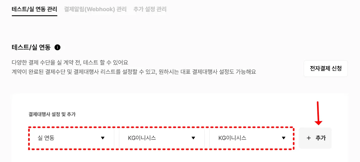 포트원 관리자콘솔 > 결제연동 > 실 연동 관리 > 결제대행사 설정 [KG이니시스] - [KG이니시스]선택 > + 추가 > 우측 화면 빈칸에 PG사로부터 받은 상점정보 입력 > 저장