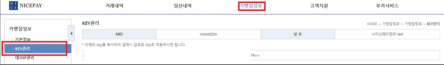 Key : 나이스페이 계약 후 메일로 전달받는 key