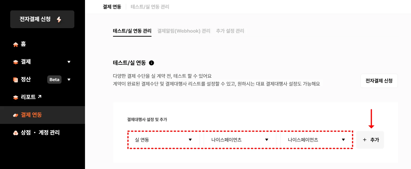 설정경로 : 결제 연동 > 실 연동 - 나이스페이먼츠 - 나이스페이먼츠 > +추가 > 상점정보 입력