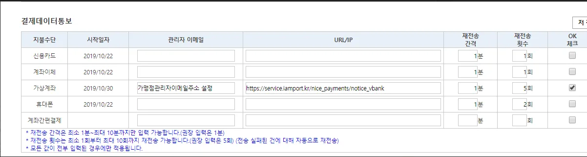 나이스페이 상점관리페이지(https://pg.nicepay.co.kr) > 가맹점 정보 > 기본정보 메뉴에서, "결제데이터통보" 의 가상계좌 부분에https://service.iamport.kr/nice_payments/notice_vbank 입력, 재전송간격 1분 , 재전송 횟수 1회혹은 그 이상으로 설정, OK체크, 가맹점 이메일 입력 후 [저장] 버튼 클릭 합니다.
